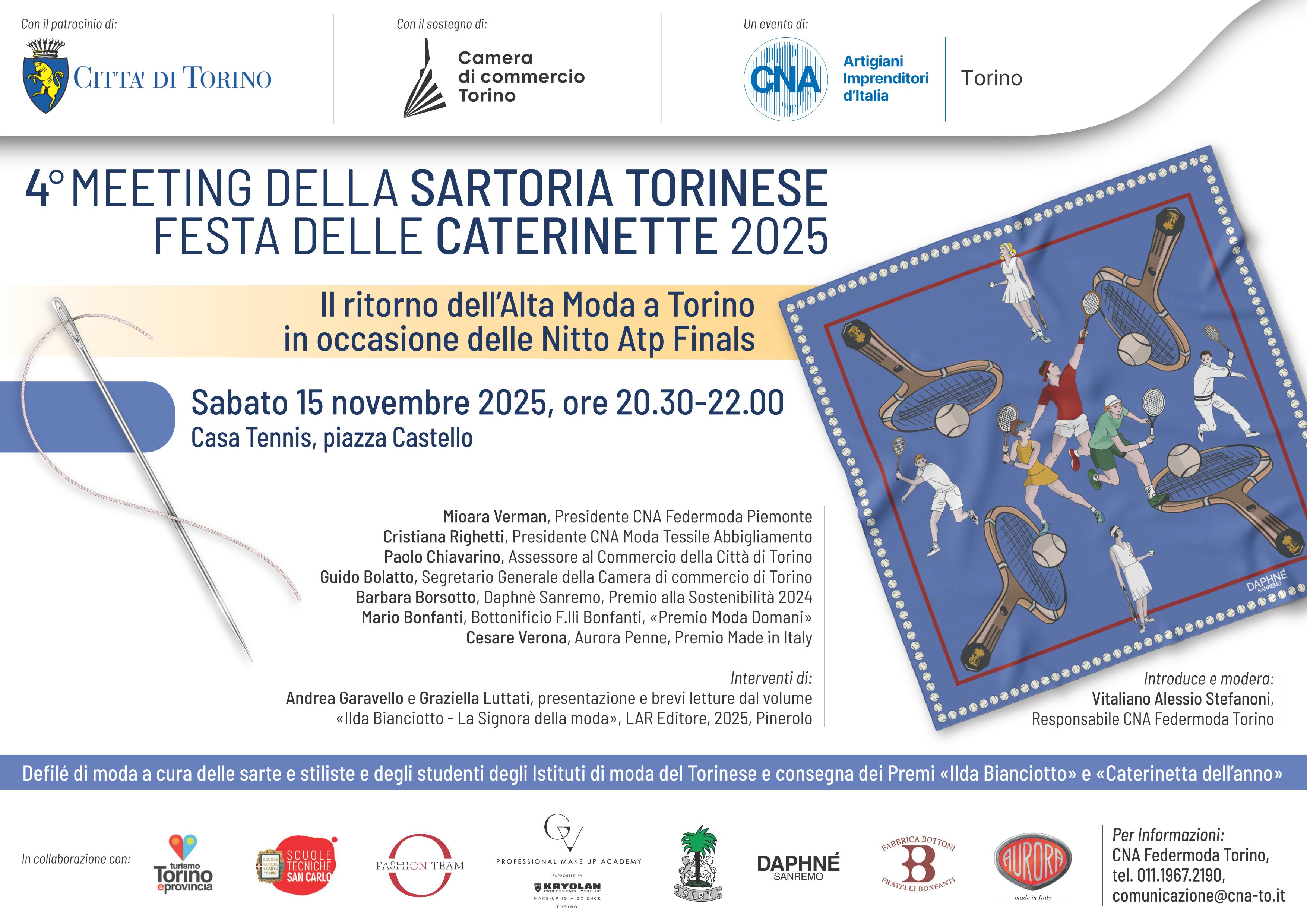 In concomitanza con le NITTO Atp Finals, che si svolgono a Torino dal 9 al 16 novembre 2025, torna anche quest'anno, grazie al contributo della Camera di commercio di Torino, il "Meeting della Sartoria Torinese - Festa delle Caterinette", giunto alla quarta edizione. Ad ospitare l'evento, sabato 15 novembre dalle ore 20.30 in Piazza Castello, sarà ancora una volta Casa Tennis.
